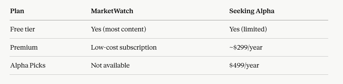 MarketWatch is largely free, with no subscription fees required to access most of its content. Seeking Alpha offers a mix of free and paid content. The free tier on Seeking Alpha gives limited article access each month before hitting a paywall. Premium starts at around $29.99 per month or $299 per year.