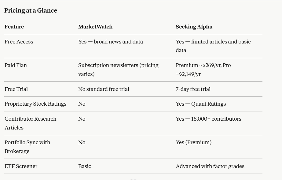 Where they diverge is in depth. MarketWatch covers all of these at a surface level that is accessible and fast. Seeking Alpha goes much deeper on each — particularly on individual stock analysis, fundamental data, and proprietary ratings.