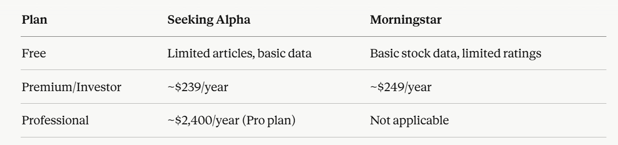 Pricing is comparable at the core subscription level. Seeking Alpha offers a 7-day free trial with its Premium plan, which gives you full access before committing to the annual subscription. Morningstar Investor also offers a trial period.