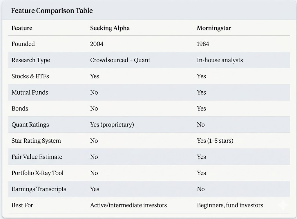 Seeking Alpha vs Morningstar — compare features, pricing, and research tools. Find out which platform suits your investment style best.